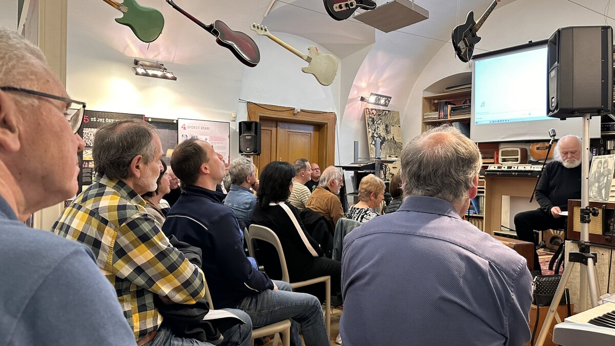 Provedl nás obdobím šedesátých a sedmdesátých let – dobou, kdy si sám tříbil hudební vkus a kdy ho Jiří v mnohém inspiroval a ukazoval mu nové cesty. Vzpomínal na Supraphonské licenční edice, které Černý často kompiloval a psal k nim skvělé sleevnoty. Nejživější momenty přinesly střety dvou světů – rocku (Deniš) a folku (Černý) – doplněné o zvukové ukázky. V jedné z nich se třeba potkává Donovan s instrumentální sestavou budoucích Led Zeppelin. Právě tyto nečekané souvislosti patřily k nejsilnějším momentům setkání. Na oslavu Karlova smíření s folkem se nás průvodce večera pokusil roztančit závěrečnou písní Cecilia od Simona & Garfunkela.